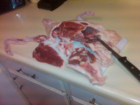 Remove the legs, breast, and wings, separate the wings at the joint. Do not separate the thigh from the drumstick.