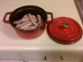 I have a couple of cups of Goose fat, left over from roasting a Christmas goose. I saved this just for duck confit, but I don't think that it will be enough. So I will render all the fat from the duck carcass by slowly roasting it at 300°. After doing this it produced another 2 cups of beautiful duck fat. So together with the goose fat, I have about 4 cups of fat total available for this confit.