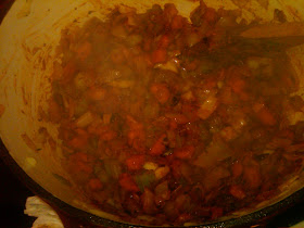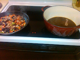 Reheat sauce and meat. Last night I got tired of tending this so I took it off a little before it was tender enough. It has still gone nearly five hours. So I removed the meat, strained the sauce, and put the meat and sauce into a bowl and into the refrigerator overnight. The picture above is the next morning after removing what fat I could. So I started off exactly the same as yesterday, sauteing my mirepoix which I luckily had plenty of, adding a touch of tomato paste, caramelizing that, and deglazing with more Dry Red Wine. To that I added more veal stock and then the meat went back in. So as you can now tell I have deviated from the original recipe, but such is what cooking is all about.