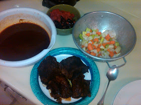 I let this simmer another two hours, removed the meat and strained the sauce again. Prepared the olives and dried prunes, and got a little more diced tomatoes and another batch of fresh vegetables ready.